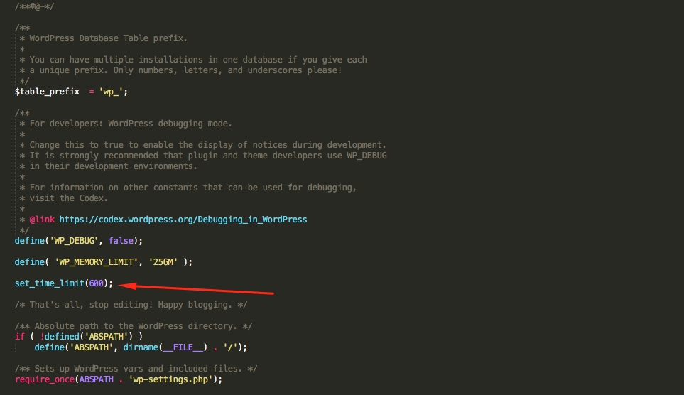 PHP Time limit: find the file wp-config.php. Add the line “set_time_limit(600);” above the line /That's all, stop editing! Happy blogging./