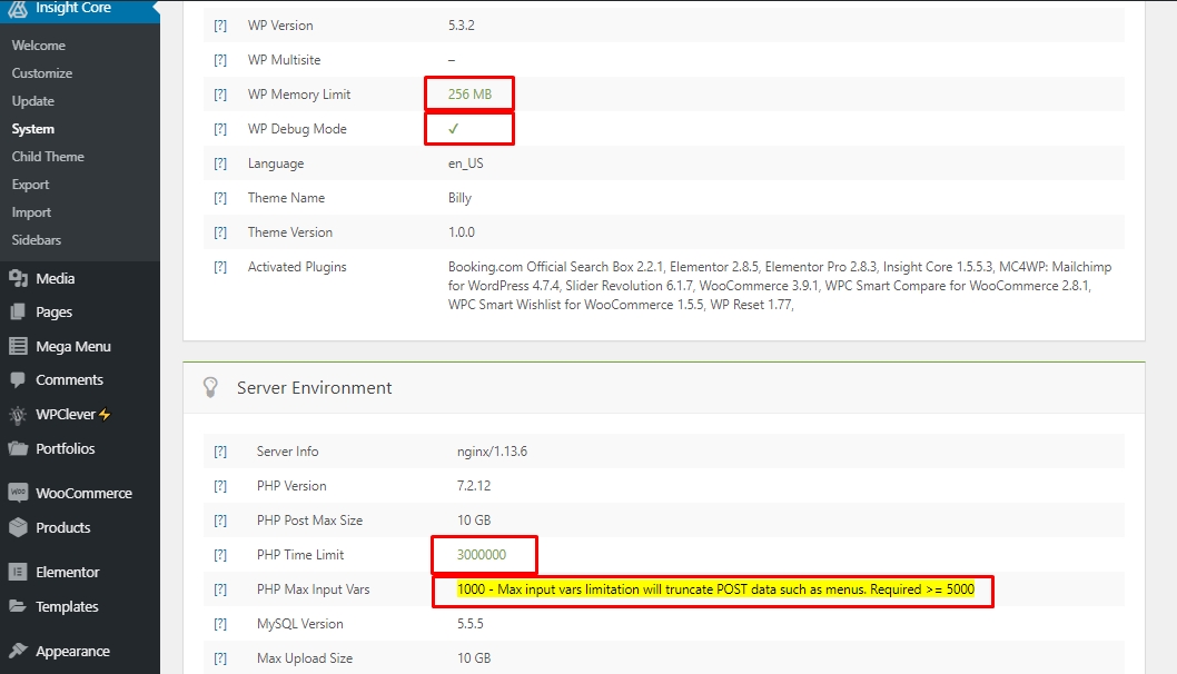 You can verify your PHP configuration limits in the System tab in the Backend-mainpage. Take a look in the left sidebar for Ecomm back end > Insight Core > system.